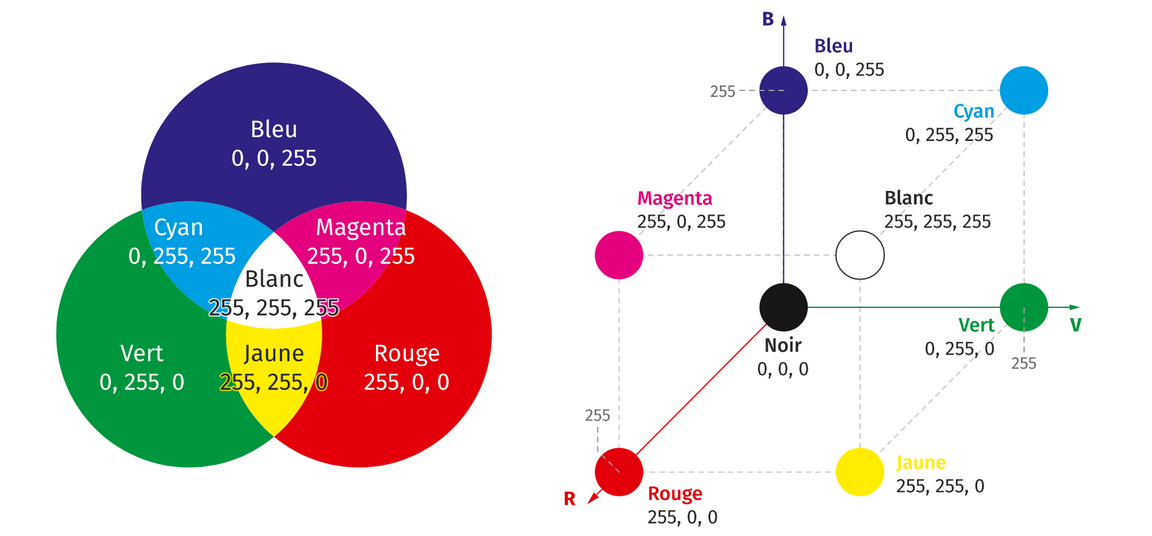 La synthèse additive des couleurs Le codage RVB : C'est le codage utilisé pour les écrans couleurs. Chaque couleur peut-être obtenue par addition des trois couleurs élémentaires ; Rouge, Vert, Bleu (Red, Green, Blue en anglais) On peut donc mémoriser un pixel en RVB en mémorisant ces trois nombres, un pour chaque couleur. |