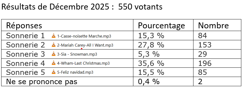 En novembre, vous avez été près de 600 à voter pour une bande-son bien connue et près de la moitié d'entre nous a choisi la sonnerie 5 qui a remporté un vif succès !