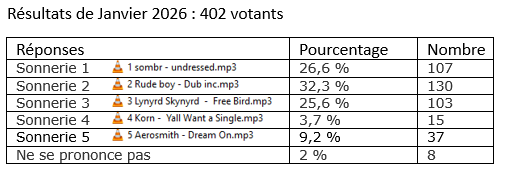 En Janvier, nous avons encore eu des soucis de réglages de compatibilité des fichiers mp3 avec le système de sonnerie. Croisons les doigts pour que tout soit enfin résolu. Nous nous excusons pour les désagréments de quelques sonneries inaudibles. Voici iles résultats :